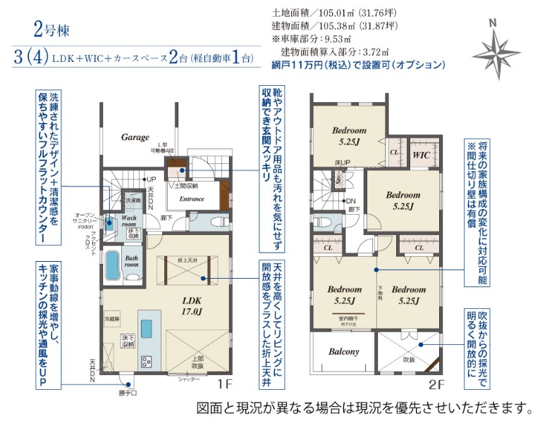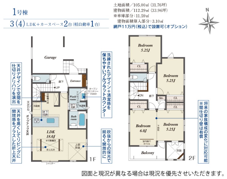 - (1号棟)112.29㎡、(2号棟)105.38㎡